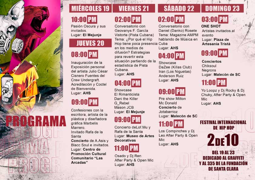 Con sedes como El Mejunje, la AHS, el Centro de Promoción Cultural Comunitario “Las cañas”, el Museo de Artes Decorativas de la ciudad y la Plaza de Artesanía “Tristá” el festival reúne a escritores, artistas visuales, músicos, investigadores y comunicadores relacionados con el hip hop y ofrecerá varios showcases y conciertos con artistas del hip hop.
